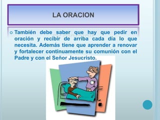 El documento describe la importancia de la oración según la Biblia. Define la oración como hablar con Dios, establecer comunión con Él a través de Jesucristo, y la forma que Dios ha provisto para que sus hijos se comuniquen con Él. Presenta el modelo de oración de Jesús conocido como el Padre Nuestro como el mejor ejemplo de oración eficaz, que incluye alabanza, confesión, peticiones e intercesión. Finalmente, señala algunas condiciones para una oración eficaz como ser específica, con