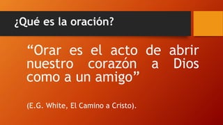 La oración es abrir nuestro corazón a Dios como a un amigo. Debemos orar en todo momento, agradeciendo a Dios que conoce nuestras necesidades incluso antes de pedirle. La oración no es para obligar a Dios sino para alinearnos con su voluntad. Se recomienda orar en privado y públicamente con entendimiento, dirigiéndonos a Dios en nombre de Jesús y reconociendo nuestra dependencia de Él.