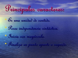 El documento resume los principales tipos de oraciones, incluyendo oraciones unimembres y bimembres. Explica que una oración bimembre se puede dividir en sujeto y predicado, mientras que una oración unimembre no. También describe los diferentes modificadores del sujeto y predicado, como los directos, indirectos, de aposición y circunstanciales. El objetivo es analizar las oraciones para reconocer la coherencia y cohesión en la expresión oral y escrita.
