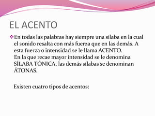 Este documento explica los diferentes tipos de acentos en español (prosódico, ortográfico, diacrítico y anfático) y la puntuación. Define cada acento y proporciona ejemplos. También clasifica las palabras según su acentuación (agudas, graves, esdrújulas y sobresdrújulas) y explica los signos de puntuación más comunes (punto, coma, etc).