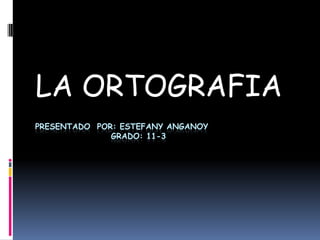 Este documento presenta información sobre la ortografía en español. Explica que la ortografía es el sistema de escritura de una lengua y las reglas que rigen cómo se colocan las letras correctamente. Además, detalla que la Real Academia Española estableció las primeras normas ortográficas del español en el siglo 18 para unificar la escritura. Finalmente, distingue entre la ortografía general, la ortografía técnica para símbolos y la ortografía tipográfica para publicaciones impresas