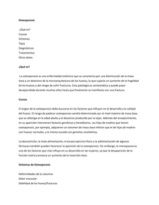La osteoporosis es una enfermedad sistémica caracterizada por una disminución de la masa ósea y deterioro de la microarquitectura de los huesos, lo que aumenta la fragilidad ósea y el riesgo de fracturas. Los principales factores de riesgo incluyen la edad, el sexo femenino, la menopausia, la dieta, el estilo de vida y algunas enfermedades. El diagnóstico se realiza mediante densitometría ósea y el tratamiento incluye fármacos para detener la pérdida