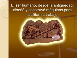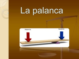 El documento explica cómo funciona la palanca, el mecanismo más elemental que consiste en una barra rígida que gira alrededor de un punto fijo llamado punto de apoyo. Se describen los tres tipos de palancas - de primera, segunda y tercera clase - según la posición del punto de apoyo, la fuerza y la resistencia. Finalmente, se mencionan algunos usos comunes de la palanca e instrucciones para construir una palanca de primera clase.