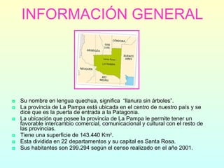 La provincia de La Pampa se encuentra en el centro de Argentina. Sus principales actividades económicas son la agricultura, especialmente de cereales, oleaginosas y hortalizas, la ganadería y la explotación forestal. El clima varía de templado en el noroeste a semiárido en el suroeste. Algunos de los platos típicos incluyen tamales, picadillos y carbonada.