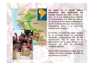 La papa es el cuarto cultivo alimenticio más importante del mundo y juega un papel fundamental en la alimentación y economía de los países andinos. El Perú es el centro de origen de la papa y alberga la mayor diversidad de variedades nativas en el mundo. Las papas nativas son una fuente importante de nutrición e ingresos económicos para las comunidades andinas, pero su biodiversidad se encuentra amenazada.