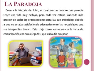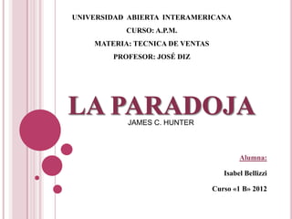 Este resumen describe el contenido de un documento sobre el libro "La Paradoja" de James C. Hunter, el cual narra la historia de un hombre llamado John que busca respuestas a sus problemas en un monasterio cristiano. En el monasterio, John conoce a Simeón, quien le enseña sobre el liderazgo a través de siete capítulos. Simeón explica que el liderazgo se basa en la influencia sobre los demás a través de la autoridad y el servicio, no del poder. Además, describe un modelo de l