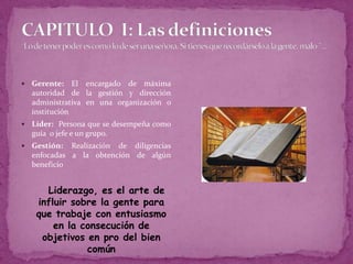 Este documento resume un libro titulado "La Paradoja, un relato sobre la verdadera esencia del liderazgo". El libro describe el viaje de un ejecutivo que creía que el poder y la autoridad eran lo más importante, pero aprende que el verdadero liderazgo se trata de servir a los demás con amor, humildad y respeto. El libro también enfatiza la importancia de crear un entorno de trabajo positivo donde las personas puedan desarrollarse para alcanzar los objetivos organizacionales.