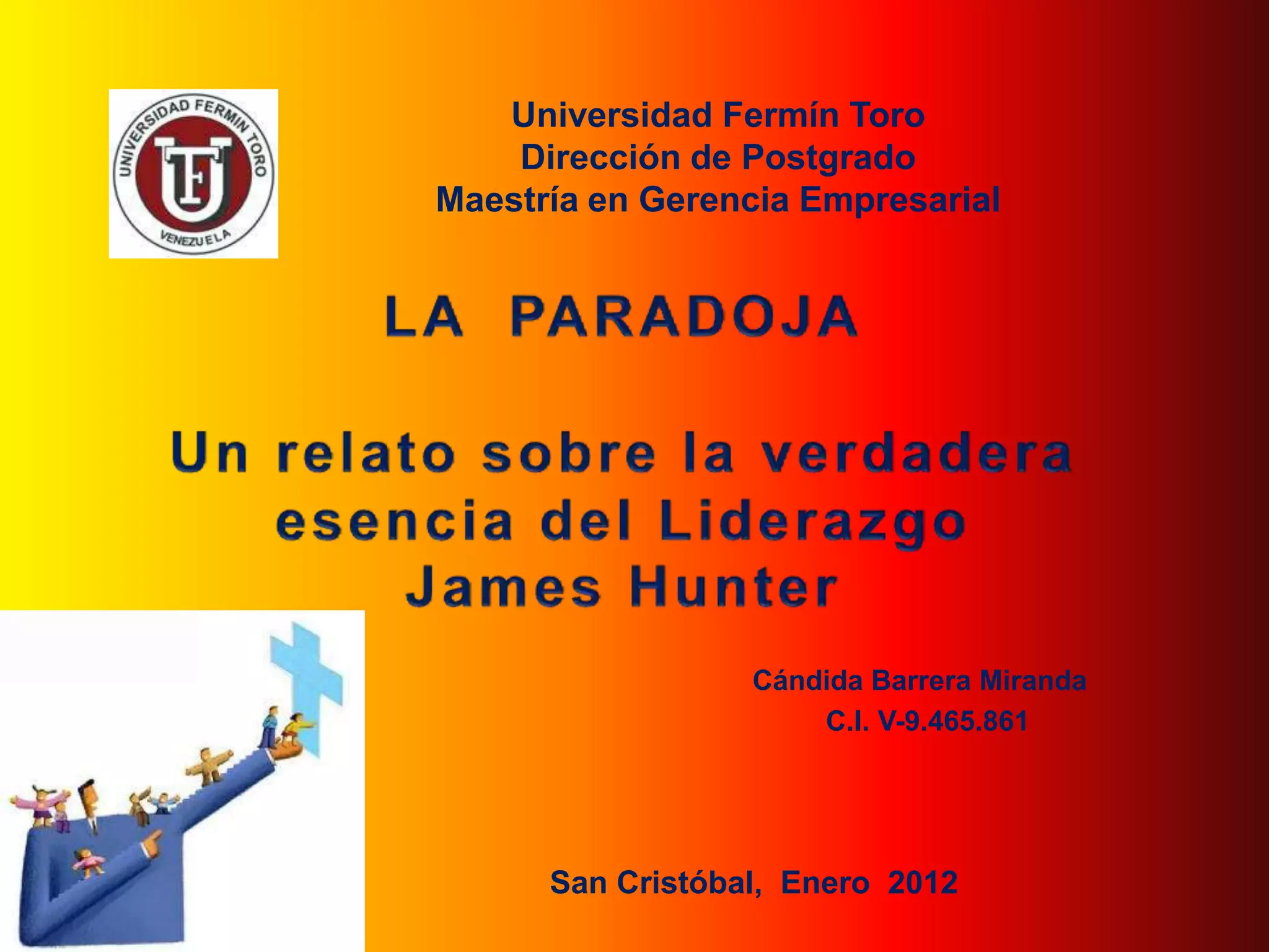 Este documento resume los siete capítulos de un libro sobre el liderazgo. Introduce al personaje Simeón, quien enseña a John sobre un nuevo paradigma de liderazgo basado en servir a otros con amor, humildad y sacrificio en lugar de usar el poder o la autoridad. Explica que el liderazgo se trata de crear un buen entorno para que las personas crezcan y desarrollar las habilidades necesarias a través de la elección de ser líderes que ponen a los demás primero.