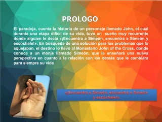Este documento narra la historia de John, una persona que atravesaba un momento difícil en su vida y tenía un sueño recurrente donde le decían que encontrara a Simeón. John termina yendo a un monasterio donde conoce a Simeón, un monje que le enseña una nueva perspectiva sobre las relaciones que cambia su vida para siempre. El documento también presenta conceptos sobre liderazgo, como servir a los demás con autoridad, sacrificio y amor.