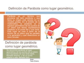 La parábola es el lugar geométrico de los puntos de un plano que equidistan de una recta fija llamada directriz y de un punto fijo llamado foco. Una parábola tiene elementos como la directriz, el foco, el vértice y el eje focal. Existen diferentes ecuaciones para representar una parábola dependiendo de la orientación de su eje focal y la posición de su vértice.