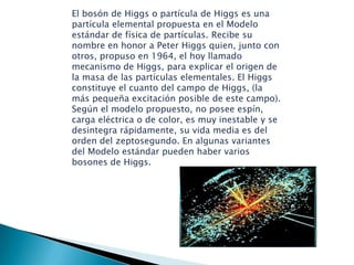 El bosón de Higgs es una partícula elemental propuesta para explicar el origen de la masa de otras partículas. Según la teoría, un campo impregna todo el espacio y las partículas que interactúan con él adquieren masa, mientras que las que no interactúan no la tienen. En 2012, el CERN anunció la observación de una nueva partícula consistente con el bosón de Higgs, pero se necesitan más datos para confirmarlo.