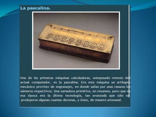 La pascalina fue inventada por Blaise Pascal para ayudar a su padre, quien era recaudador de impuestos del rey, en sus labores de cálculo. Aunque Pascal es más conocido por sus "Pensamientos", también fue un brillante físico que hizo contribuciones a la hidráulica. Pascal murió joven atormentado por un profundo sentimiento de culpa.