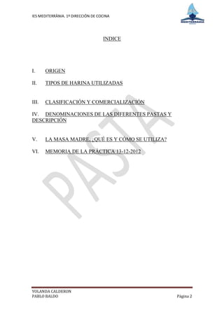 El documento habla sobre el origen y tipos de pasta. Explica que aunque la pasta se originó en China, se popularizó en Italia. Describe los diferentes tipos de harina que se usan, las clasificaciones de pasta fresca y seca, y las diferentes formas y denominaciones de pasta como espagueti, macarrones, ravioles y más.