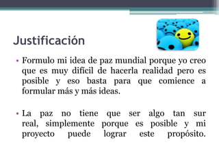 Este documento propone la idea de lograr la paz mundial a través de mega conciertos de bandas de diferentes orígenes étnicos que se realizarían en las fronteras entre culturas para demostrar igualdad. El objetivo es que los costos sean bajos o nulos buscando apoyo externo de gobiernos, fundaciones u otras instituciones. El documento concluye indicando que una sonrisa no cuesta nada pero puede valer mucho para el mundo.