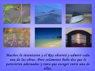 El Rey ofreció un premio al mejor artista que pudiera plasmar "la paz perfecta" en un lienzo. Dos pinturas fueron seleccionadas como las mejores: la primera mostraba un lago tranquilo entre montañas, mientras que la segunda mostraba montañas tormentosas con rayos y una cascada furiosa. Sin embargo, detrás de la cascada había un nido con un pájaro alimentando a sus polluelos, demostrando que la paz puede encontrarse incluso en medio del caos. El Rey eligió esta segunda pintura porque