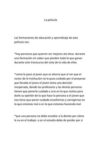 La película trata sobre las enseñanzas de la vida y la importancia de perseguir los sueños. Algunos puntos clave son: 1) No se debe envidiar el éxito de los demás y cada uno debe lograr sus propias metas. 2) Es importante que los profesores guíen a los estudiantes y corrijan sus errores. 3) Cada persona debe estudiar lo que le apasiona y no lo que los padres quieran, para evitar arrepentimientos.