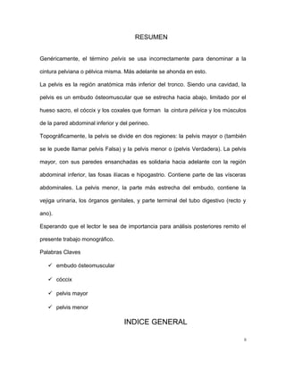 Este documento describe la clasificación y partes de la pelvis ósea. Se divide la pelvis en cuatro tipos principales (ginecoidea, androide, antropoide y platipeloide), según su forma. También se divide anatómicamente en pelvis mayor y menor, separadas por el estrecho superior. Finalmente, describe las partes óseas como el sacro, cóccix e huesos coxales, así como las diferencias entre la pelvis masculina y femenina.