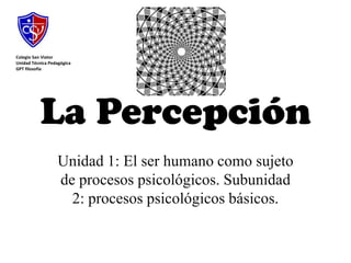 Este documento trata sobre los procesos psicológicos básicos de la percepción. Explica conceptos como estímulo, órganos sensoriales, sensación y percepción. También describe leyes y fenómenos de la percepción como la figura y el fondo, la buena forma, el cierre y la proximidad. Por último, menciona la constancia perceptiva e ilusiones perceptuales.