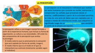 Este documento describe la percepción como el proceso por el cual los seres humanos reciben, interpretan y comprenden señales del exterior. Explica que la percepción está influenciada por factores internos y externos del individuo. También describe varias leyes y constancias perceptuales, como la ley de proximidad, semejanza y continuidad, así como las constancias de tamaño, forma y luminosidad. Por último, señala que las alteraciones de la percepción pueden deberse al estrés de la vida moderna.