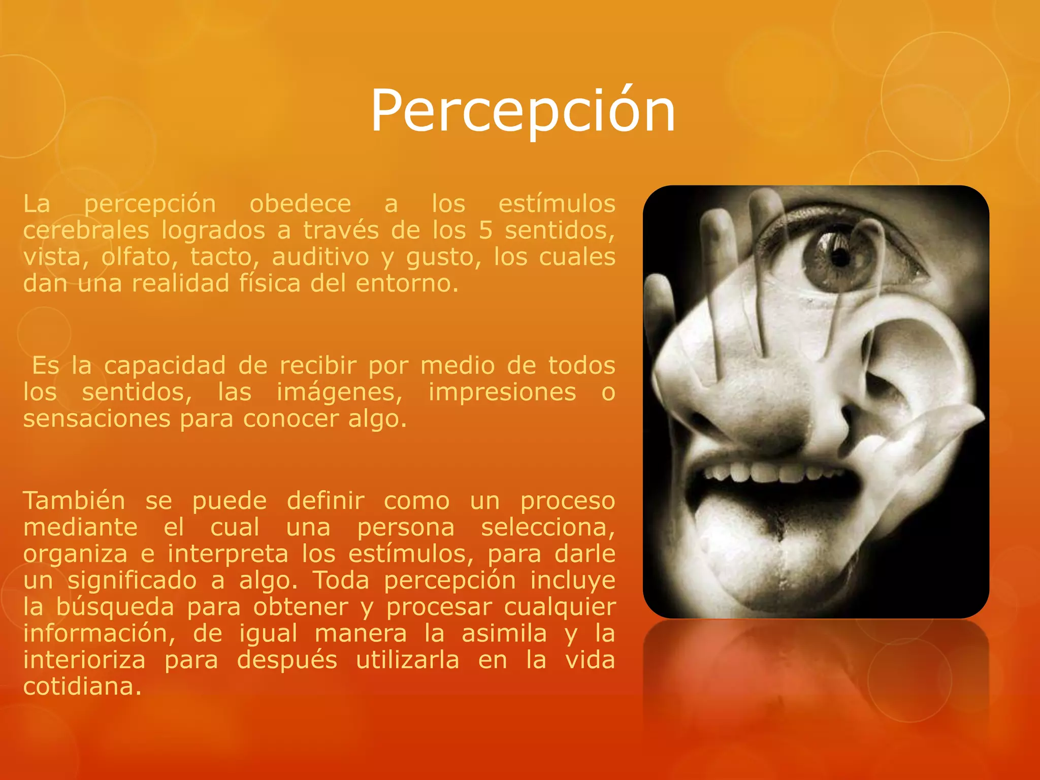 La percepción se refiere a la capacidad de recibir información del entorno a través de los cinco sentidos y darle significado. Incluye la selección, organización e interpretación de estímulos. La percepción puede verse influenciada por la motivación, atención y habilidades perceptuales como reconocer patrones, mantener constancias de tamaño y forma, y percibir profundidad y movimiento. Algunos sugieren que también existe una "percepción extrasensorial" para adquirir información por medios distintos a los cinco sent