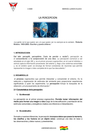 La percepción es el proceso cognitivo por el cual los individuos interpretan y comprenden el entorno a través de los sentidos. El documento explica que la percepción incluye la selección, organización e interpretación de los estímulos ambientales para darles significado. Además, señala que la percepción depende de factores como la atención, experiencias previas, necesidades y es relativa al observador y su contexto. Finalmente, concluye que la percepción crea una representación mental de la realidad a partir de los estímulos sens