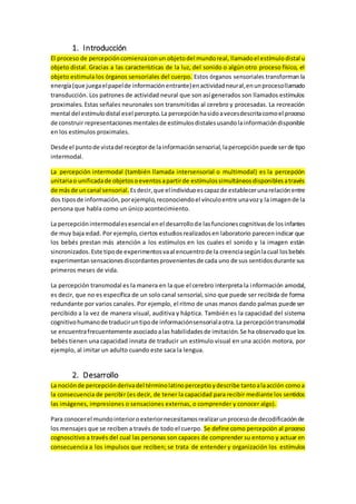 El documento habla sobre la percepción. Explica que la percepción comienza con un estímulo externo que es procesado por los sentidos y el cerebro para crear una representación mental. Describe dos tipos de percepción: intermodal, que involucra más de un sentido; y transmodal, que interpreta información que puede ser recibida por varios sentidos. También explica las etapas de la percepción y diferentes teorías como la de Gestalt.