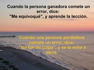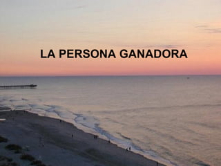 El documento contrasta las características de una persona ganadora frente a una persona perdedora, señalando que una persona ganadora asume la responsabilidad de sus errores, aprende de la adversidad, cree que puede controlar los resultados a través de su esfuerzo, y busca mejorar continuamente, mientras que una persona perdedora culpa a los demás, se siente víctima de las circunstancias, y está satisfecha con el statu quo.