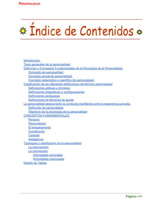 El documento presenta una introducción a la personalidad desde diferentes perspectivas. Define la personalidad como los patrones de pensamiento que distinguen a una persona y persisten a través del tiempo y situaciones. Explica que existen diferentes definiciones como las aditivas que ven la personalidad como la suma de características, las integrativas que enfatizan la estructuración de características, y las jerárquicas donde hay un factor dominante. También cubre conceptos fundamentales como la persona, el temperamento, el carácter e inteligencia y tipos de personalidad como la extrovers