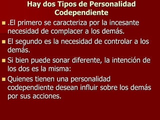 Este documento describe la personalidad codependiente y sus dos tipos principales: la necesidad de complacer a los demás y la necesidad de controlar a los demás. Las personas codependientes desarrollan estas personalidades debido a familias disfuncionales y el miedo al abandono. Si no se trata, la conducta codependiente puede empeorar y causar problemas de salud, depresión u otras situaciones complejas. Sin embargo, la codependencia siempre puede tratarse a través de terapias individuales o grupales.