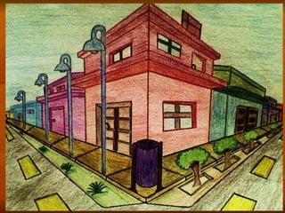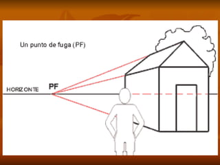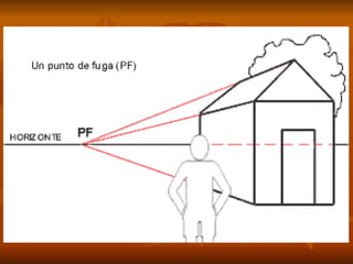 El documento describe los principios y elementos de la perspectiva cónica en el Renacimiento. Explica que la perspectiva representa las formas en un plano de manera aproximada a como se ven y no con sus medidas reales. También describe los tipos de perspectiva lineal y oblicua, señalando que la lineal muestra líneas paralelas convergiendo a distancia y la oblicua tiene dos puntos de fuga.