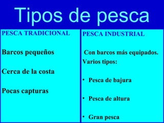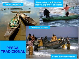 Este documento describe dos tipos principales de pesca: la pesca tradicional, realizada cerca de la costa por barcos pequeños con artes tradicionales, y la pesca industrial, llevada a cabo por grandes barcos equipados que se alejan cientos de kilómetros de la costa en búsqueda de los principales caladeros mundiales. También se mencionan algunos problemas actuales como la sobrepesca y las disputas políticas por el uso de las zonas de pesca.