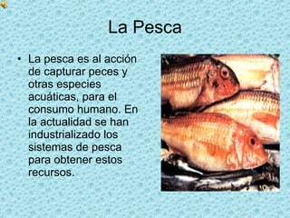 Este documento describe los diferentes aspectos de la pesca en Argentina. Explica que la pesca puede ser continental o oceánica y menciona algunos de los principales tipos de pescados exportados por el país como la merluza, el calamar y otros. También describe las diferentes fases del proceso productivo de la pesca, incluida la captura, procesamiento industrial y comercialización.