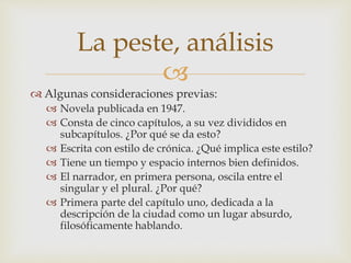 El documento resume el análisis por capítulos de la novela La Peste de Albert Camus. Explica que consta de cinco capítulos divididos en subcapítulos, y describe los personajes y eventos clave del primer capítulo, incluyendo la introducción de la peste en la ciudad de Orán y las reflexiones que genera en los personajes.