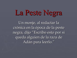 La peste negra fue una pandemia de peste bubónica que asoló Europa entre 1347 y 1351, causada por la bacteria Yersinia pestis. Se originó en Asia y llegó a Europa a través de puertos mediterráneos, matando aproximadamente a un tercio de la población europea. Los síntomas incluían inflamación de los ganglios linfáticos, fiebre y debilidad. Aunque se buscaron chivos expiatorios como los leprosos y judíos, la causa real fue la bacteria transmitida por pulgas infect