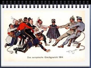 La Primera Guerra Mundial comenzó debido a las rivalidades entre las potencias europeas y estalló cuando el archiduque Francisco Fernando de Austria fue asesinado en 1914. La guerra involucró a las potencias aliadas y las potencias centrales y consistió en una guerra de movimientos inicial, luego una guerra de trincheras entre 1915-1916, y finalmente una ofensiva alemana fallida en 1918 que llevó a la victoria aliada y el fin del conflicto con el armisticio de 1918.