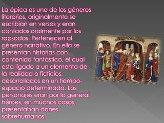 El documento describe los principales aspectos de la épica como género literario. Explica que originalmente se escribían en verso y se contaban oralmente, narrando historias fantásticas sobre héroes y personajes sobrenaturales. Luego detalla las características y clasificación de diferentes obras épicas de culturas como la griega, latina, hindú, anglosajona y española.