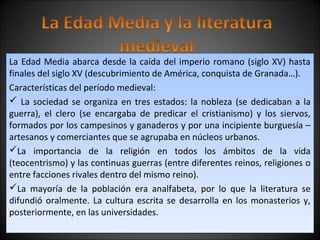 La Edad Media abarca desde la caída del Imperio Romano hasta finales del siglo XV. Se caracteriza por una sociedad dividida en estados (nobleza, clero y campesinos), la importancia de la religión y las continuas guerras. Durante este periodo convivieron tres culturas (cristiana, judía y musulmana) en la Península Ibérica.