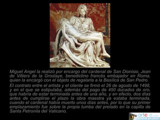 La Piedad de Miguel Ángel se encuentra en la Basílica de San Pedro en el Vaticano. Miguel Ángel creó la escultura por encargo de un cardenal francés para regalarla a la basílica. Miguel Ángel seleccionó personalmente el bloque de mármol en las canteras de los Alpes y esculpió la figura de la Virgen sosteniendo el cuerpo de Cristo muerto.