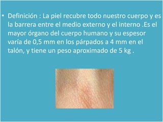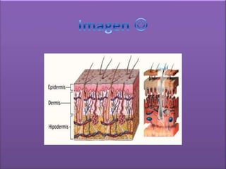 La piel se divide en tres capas: la epidermis externa, la dermis intermedia y la hipodermis más profunda. La epidermis contiene melanocitos que producen melanina y la protegen de las radiaciones solares. La dermis contiene fibras, receptores sensoriales, glándulas y vasos sanguíneos que le dan elasticidad y sensibilidad. La hipodermis está formada principalmente por grasa que almacena energía y aisla el cuerpo.