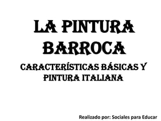 El documento describe las características y corrientes estilísticas principales de la pintura barroca en Italia. La pintura barroca se caracteriza por el dominio de la perspectiva, el uso de la luz y el color sobre el dibujo, y la representación realista de temas sagrados y mundanos. En Italia hubo tres fenómenos estilísticos: el naturalismo de Caravaggio, el clasicismo de los Carracci, y el estilo decorativo de los pintores venecianos como Tiepolo y Canaletto.
