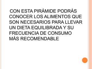 La pirámide alimentaria proporciona una guía para una dieta equilibrada al recomendar los alimentos necesarios y su frecuencia de consumo ideal, complementada con el consumo de agua y la realización de actividad física, para llevar un estilo de vida saludable.