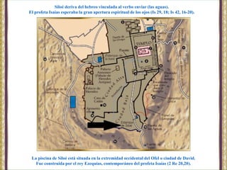 El documento describe la Piscina de Siloé, un estanque situado en Jerusalén que fue construido por el rey Ezequías en el siglo VIII a.C. para abastecer de agua a la ciudad durante los asedios. Ezequías ordenó excavar un túnel que desviaba el manantial de Guijón hacia la piscina dentro de las murallas. La piscina se usó para rituales religiosos hasta la destrucción del templo judío en el año 70 d.C.
