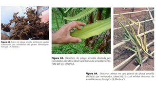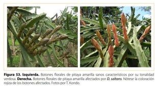 Este documento describe la pitaya, incluyendo su descripción botánica, raíces, tallos, flores y propagación. Explica que la pitaya pertenece a los géneros Selenicereus e Hylocereus y se encuentra desde México hasta Brasil. Describe las características de las raíces, tallos triangulares verdes, flores blancas o rosadas de 15-30 cm que se abren de noche, y su propagación mediante esquejes. También discute los problemas como malezas y plagas, su importancia en México, y rentabil