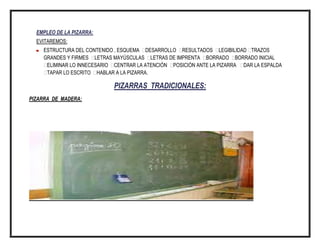 El documento describe diferentes tipos de pizarras tradicionales y modernas, incluyendo pizarras de madera, blancas, de plástico, electrónicas y digitales interactivas portátiles. Explica que las pizarras electrónicas permiten interactuar con contenido proyectado y convertir cualquier superficie plana en un área interactiva usando la pizarra y pluma electrónicas. Finalmente, señala que para que los profesores utilicen pizarras digitales interactivas en clase deben ser fáciles de usar