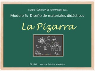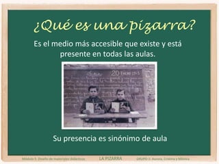 El documento describe la pizarra como el medio de apoyo didáctico más antiguo y accesible presente en todas las aulas. Explica que para su uso óptimo, el profesor debe estructurar y ordenar la información de manera legible, borrar adecuadamente y posicionarse de forma que no obstaculice la visión. Además, la pizarra permite esquematizar información, transmitir contenidos directos de forma sencilla y que los estudiantes practiquen y expongan.
