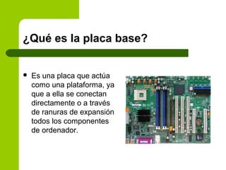 La placa base es la plataforma central de un ordenador a la que se conectan todos los componentes. Incluye tarjetas de expansión, buses, chips y el chipset, que gestiona los periféricos y la transferencia de datos. El microprocesador controla todas las operaciones. La memoria incluye RAM para almacenar datos temporalmente, memoria caché para acelerar el procesador, y ROM para iniciar el sistema.