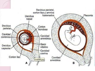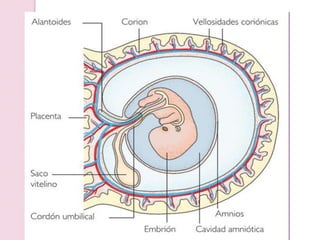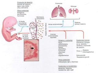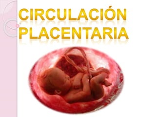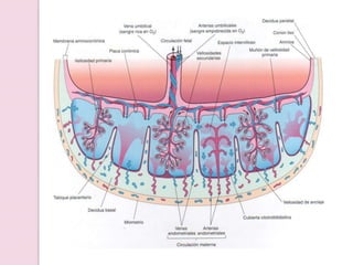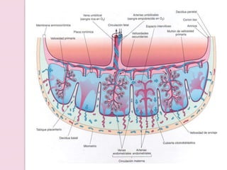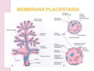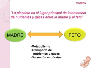 La placenta es el órgano que permite el intercambio de nutrientes, gases y desechos entre la madre y el feto a través de la membrana placentaria. La sangre materna y fetal circulan por lados opuestos de la membrana sin mezclarse, permitiendo el paso de sustancias a través de la membrana por diferentes mecanismos como la difusión simple, difusión facilitada y transporte activo.