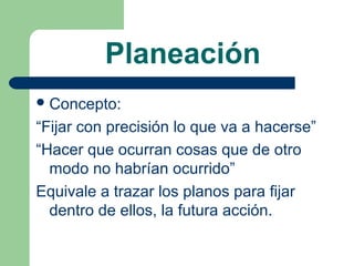 Este documento describe la planeación administrativa y su importancia. Define la planeación como fijar con precisión lo que se va a hacer para lograr objetivos de manera eficiente. Explica que la planeación es importante para la eficiencia, dinámica, objetivos, economía y control de una organización. También cubre principios, tipos, fases y técnicas de planeación como manuales, diagramas de flujo, gráficas de Gantt, presupuestos, pronósticos, PERT y CPM.