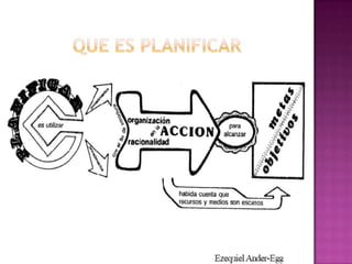 El documento discute la importancia de la planificación en la educación. La planificación educativa proporciona un lenguaje común, coherencia en el tiempo del proceso educativo, reduce la incertidumbre y permite la evaluación de lo que se hace. También favorece el trabajo en equipo y evita la improvisación. El documento argumenta que los docentes son gerentes de una empresa educativa y, al igual que los buenos gerentes, deben planificar sus lecciones para alcanzar los objetivos de aprendizaje de calidad de una manera eficaz.