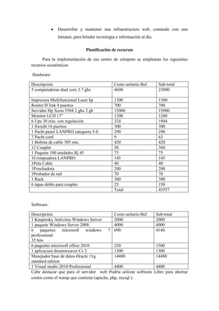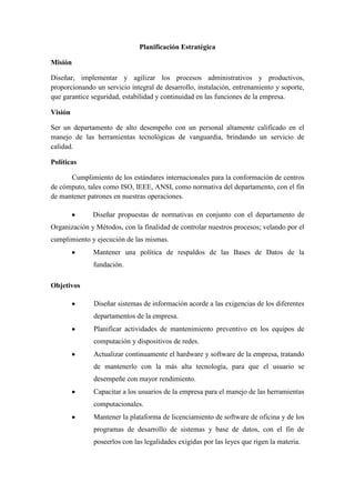 El documento presenta un plan estratégico para la implementación de un centro de cómputo en una empresa. Incluye la misión, visión y políticas del departamento, así como objetivos, recursos requeridos y su costo, software necesario, capacitación del personal, infraestructura, ubicación, instalación y roles clave como el analista, gerente de sistemas y administrador de base de datos.
